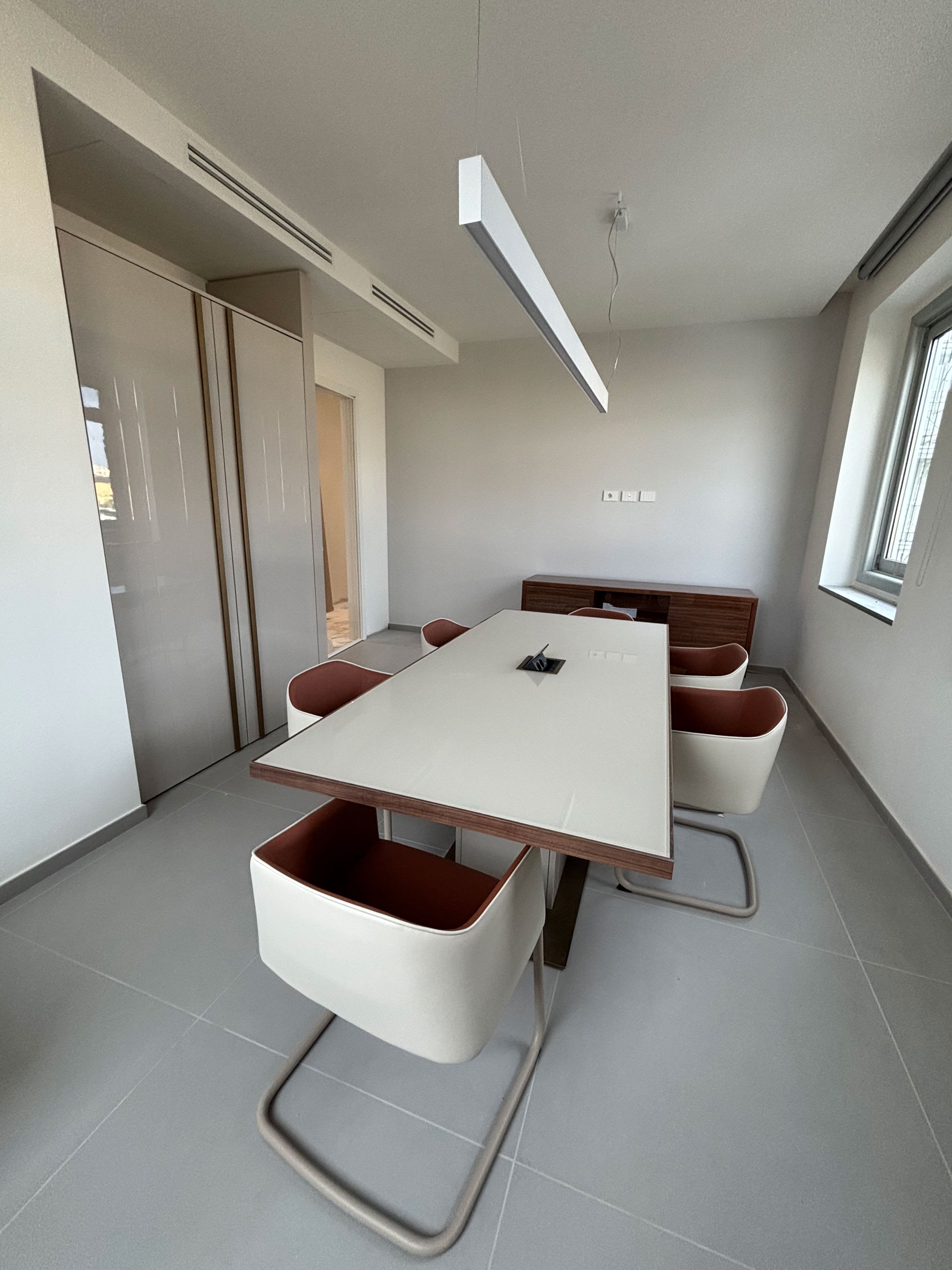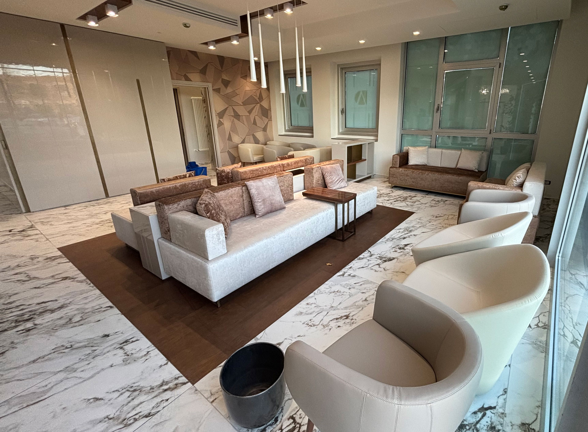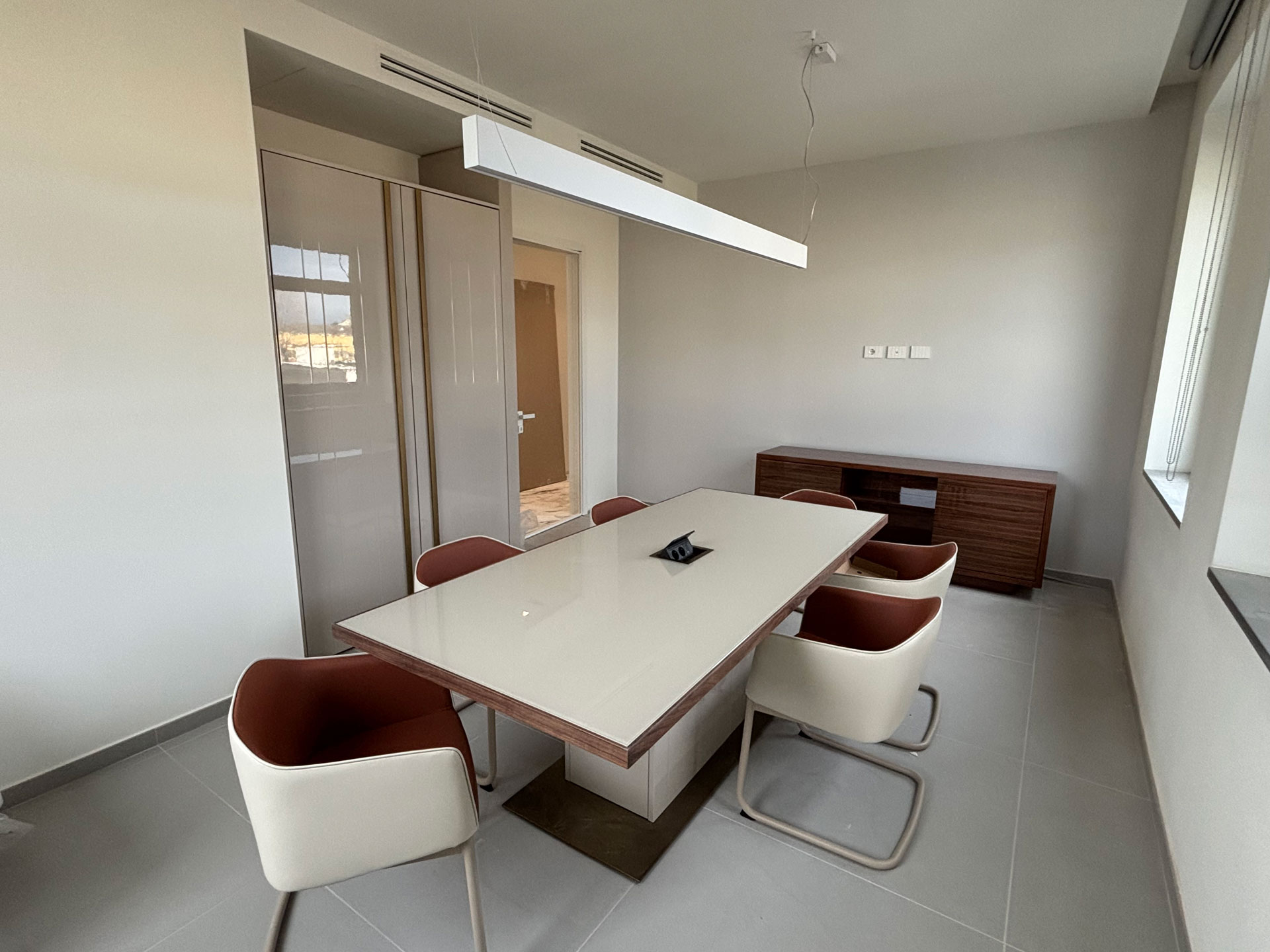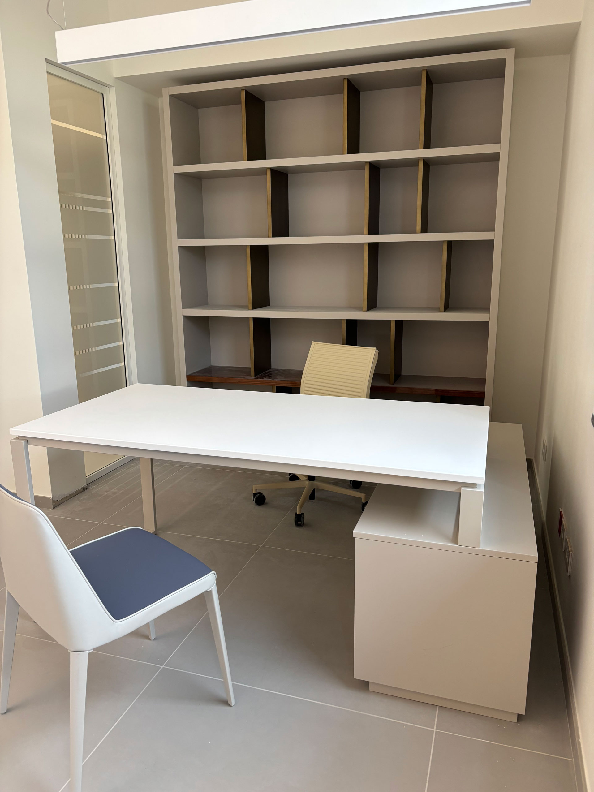 For a corporate office complex in Tuscany, we created custom furnishings designed to combine functionality, comfort, and elegance. From the wood paneling adorning the staircase handrail to the reception desk, including the office and meeting room furnishings, every aspect was meticulously considered.