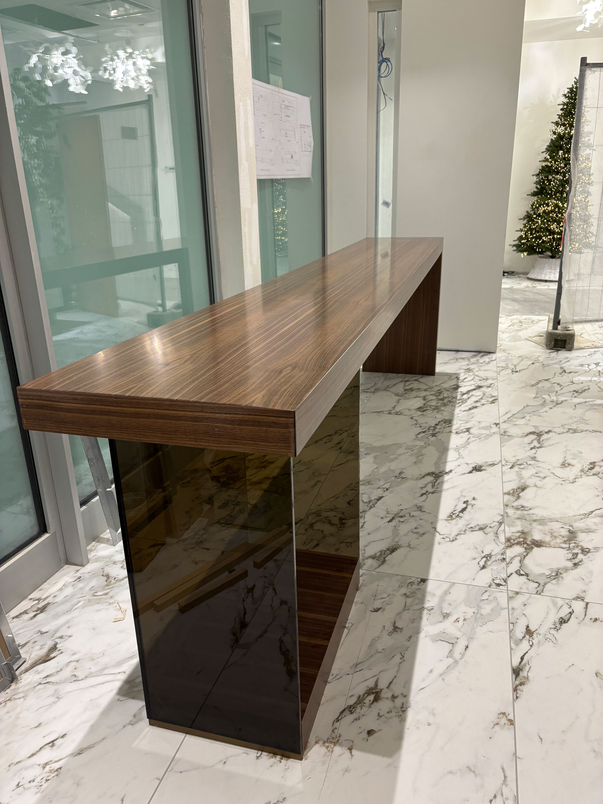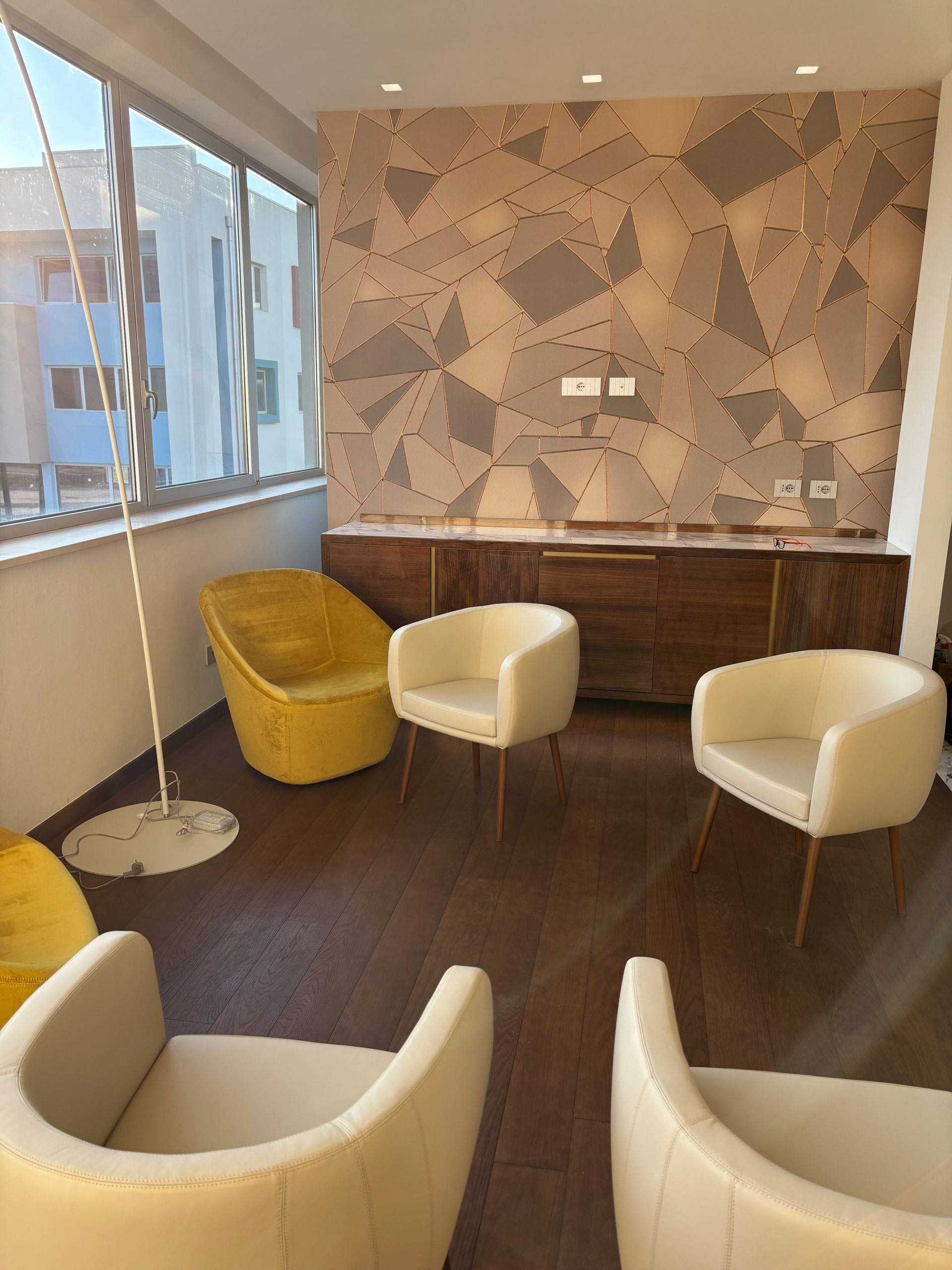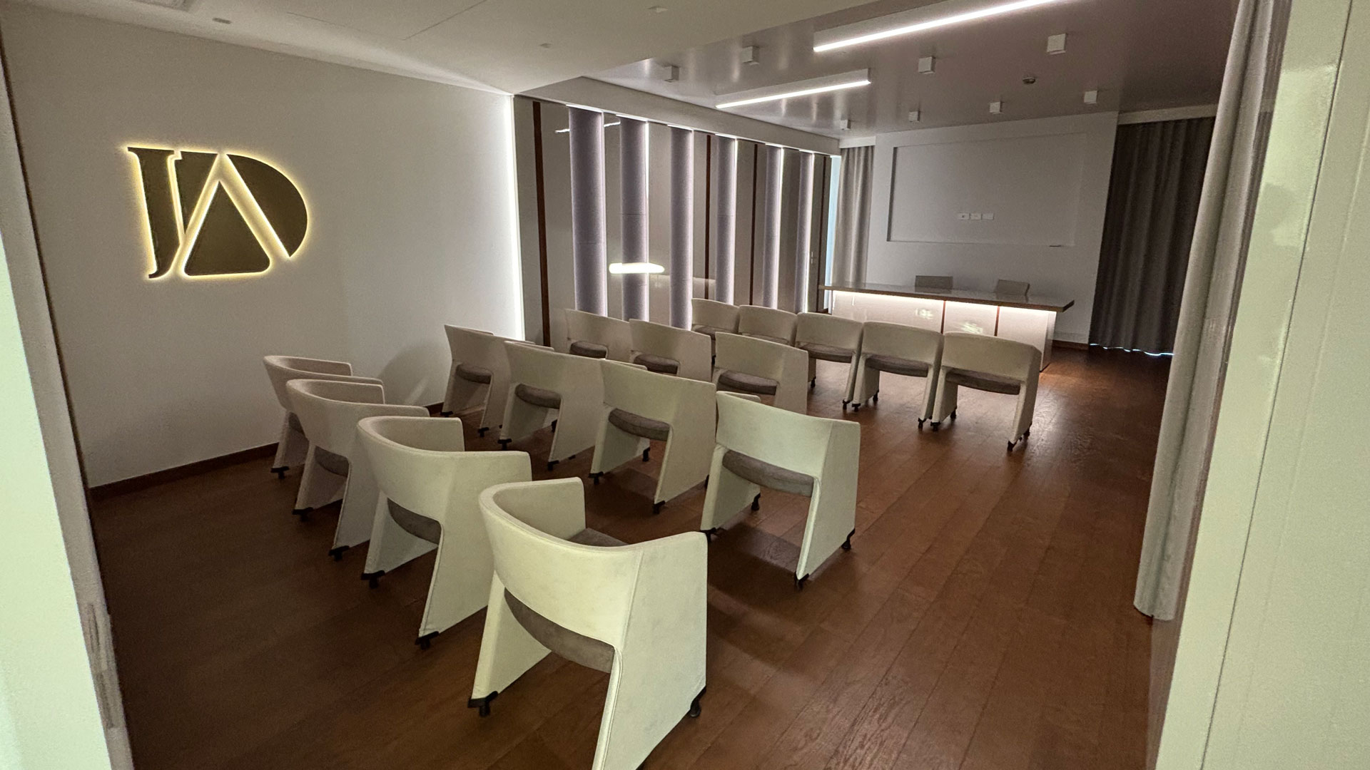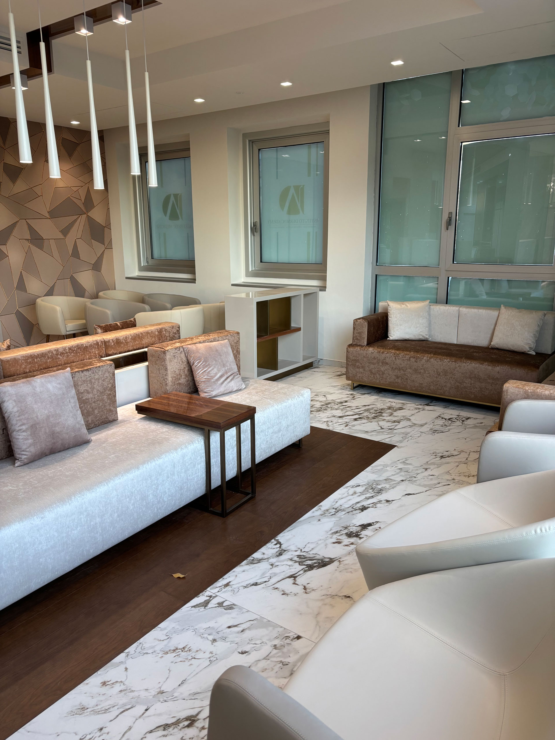 For a corporate office complex in Tuscany, we created custom furnishings designed to combine functionality, comfort, and elegance. From the wood paneling adorning the staircase handrail to the reception desk, including the office and meeting room furnishings, every aspect was meticulously considered.